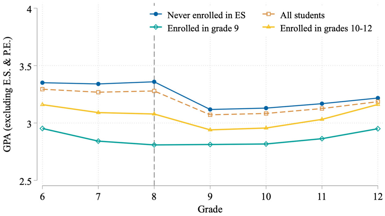 | ES × grade 8 GPA 2.0–3.0 | 0.144** (0.033) | −0.088** (0.021) | ||||||||||