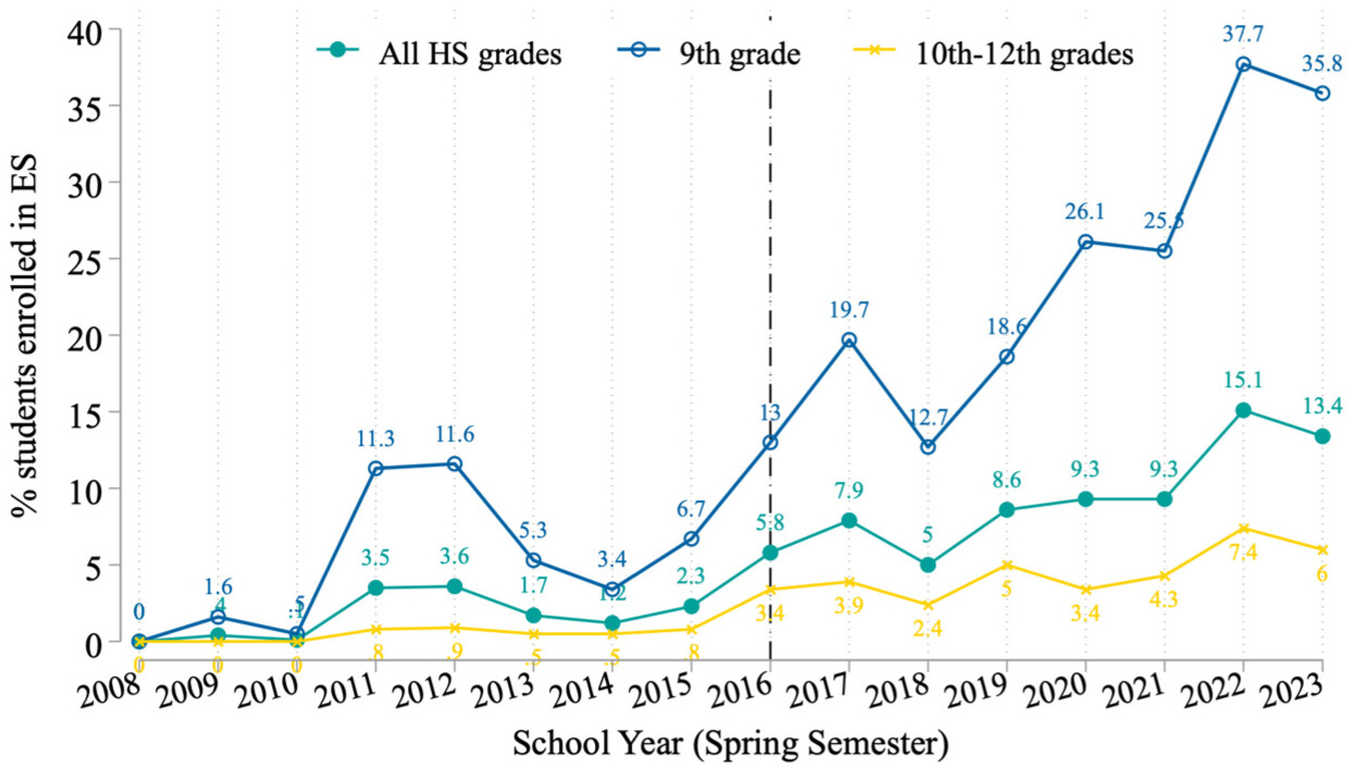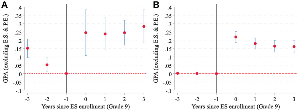 | Effect | ES enrollment in grade 9 | ES enrollment in grades 9–12 | ||