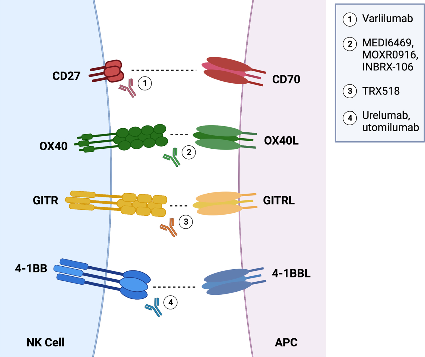 NK cells are characterized partly by their expression of several important activating receptors, including but not limited to the FcγRIIIA (CD16) receptor, which is critical for NK cell-driven antibody dependent cellular cytotoxicity (ADCC). Additionally, NK cells express natural group 2D (NKG2D) and natural cytotoxicity receptors (NCRs) NKp30, NKp44, and NKp46, as well as members of the signaling lymphocyte activation molecule (SLAM) family [59–61]. It is established that NK cells require a concerted engagement across these activating receptors to realize their full activation potential [62, 63]. NK cells also possess a number of co-stimulatory molecules [64]. For purposes of this review, we focus on 4-1BB (CD137), OX40, GITR, and CD27 as these molecules are already being targeted clinically for treatment of hematologic malignancies and advanced solid tumors. These molecules are part of the tumor necrosis factor receptor superfamily (TNFRSF) and are important for enhancing an antitumor response (Fig. 2) [46]. While CD27 is constitutively expressed on immature NK cells, naïve and memory differentiated T cells, and memory B cells and plasma cells, 4-1BB, OX40, and GITR are upregulated only after activation of effector cells [65, 66].