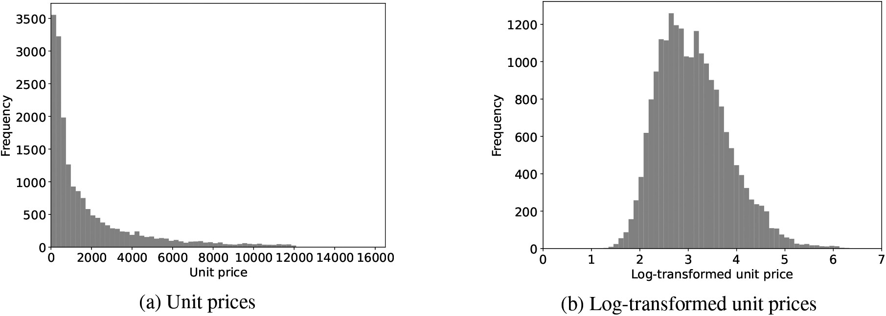 1a presents a histogram of the unit prices of the artworks. As shown, the distribution of unit prices is highly right-skewed. To reduce the deviation in the unit prices and make the target variable normally distributed, we used the log-transformed unit prices as the targets, as follows: