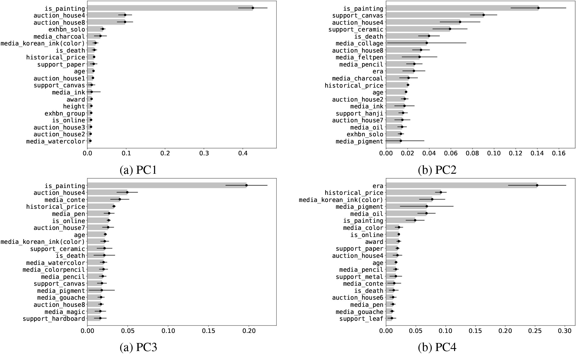 18]. In other words, it is assumed that that the values of artworks can be determined using numerous factors, such as the size, the subject matter, the style, the reputation and nationality of the artist, whether the work contains the signature of the artist, and the auction house where the sale occurs [