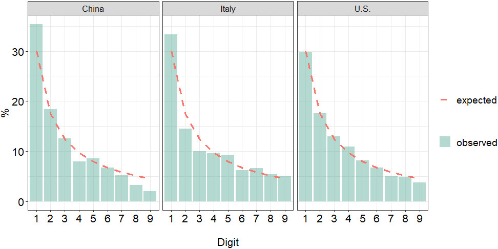 In spite of this difficulty, we identified which columns were used to run Benford Law first digit analysis. Then, we saved the spreadsheets as independent files and after some data cleaning we produced three files in .xlsx format: China, Italy and US. All data is aggregated by country with daily periodicity. We have collected data from February 28, 2020 to July 1, 2020.