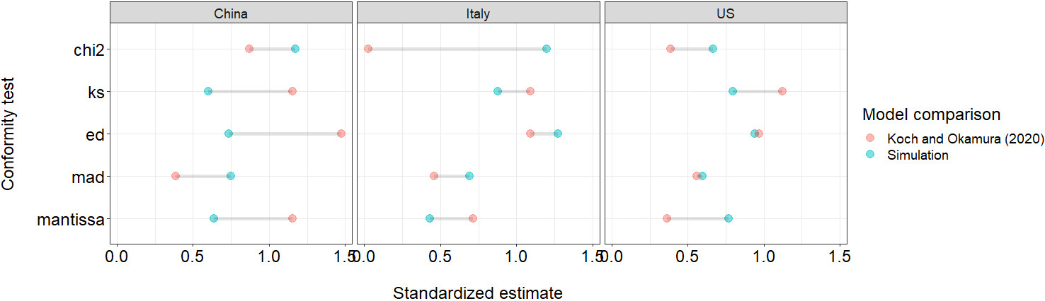 2 compares the conformity measures from the simulated data, which perfectly fits the Benford-Law expectations, to the goodness-of-fit estimates reported in Koch and Okamura (2020).