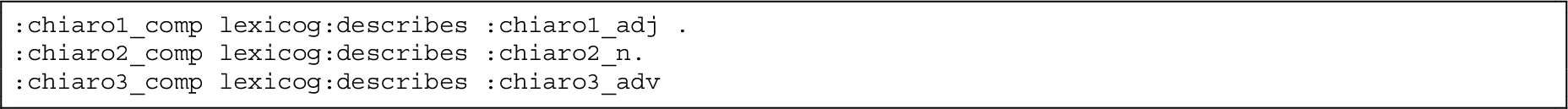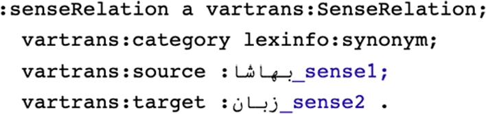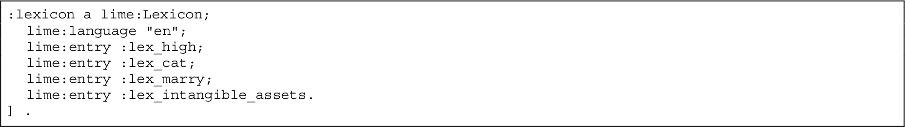 | Lexicog (OntoLex-Lemon) | DC, LexInfo, SKOS, VOID, XSD | Lexica and Dictionaries | CC0 | Version 1.0, (2019-03-08) | Section 4.2 and Section 5.1.1 |
