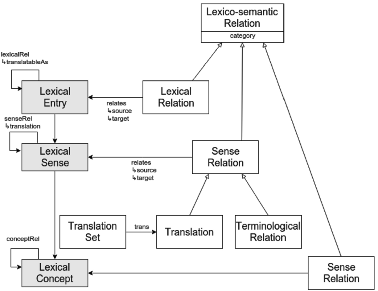 The most well known model for the creation and publication of lexica and dictionaries as linked data is OntoLex-Lemon45 [39] (see Appendix x for an introduction to the model with examples, and Section 5.1 for extensions and further developments). This was an output of the W3C Ontology-Lexica working group (we will refer to this as the OntoLex group in what follows) which also manages its ongoing development along with the publication of further extensions. OntoLex-Lemon is based on a previous model, the LExicon Model for ONtologies (lemon) [121] and as was the case with its predecessor, it is intended as a model for enriching ontologies with linguistic information and not for modelling dictionaries and lexica per se. Thanks to its popularity, however, it has come to take on the status of a de facto standard for the modelling and codification of lexical resources in RDF in general. Resources which have been modelled using OntoLex-Lemon include the LLD version of the Princeton Wordnet,46 DBnary (the linked data version of Wiktionary) [155], and the massive multilingual knowledge graph Babelnet [60].