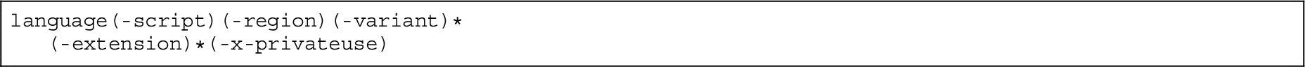 137. A. Phillips and M. Davis, BCP 47 – Tags for Identifying Languages, Technical Report, Internet Engineering Task Force, 2006. http://www.rfc-editor.org/rfc/bcp/bcp47.txt.