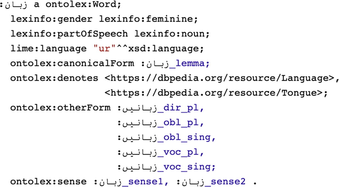 The OntoLex-Lemon model is modular and consists of a core module along with modules for Syntax and Semantics,47Decomposition,48 and Variation and Translation,49 as well as a dedicated metadata module, lime50 (all of which are described in Appendix x, except for lime which is described in Section 5.3.3).
