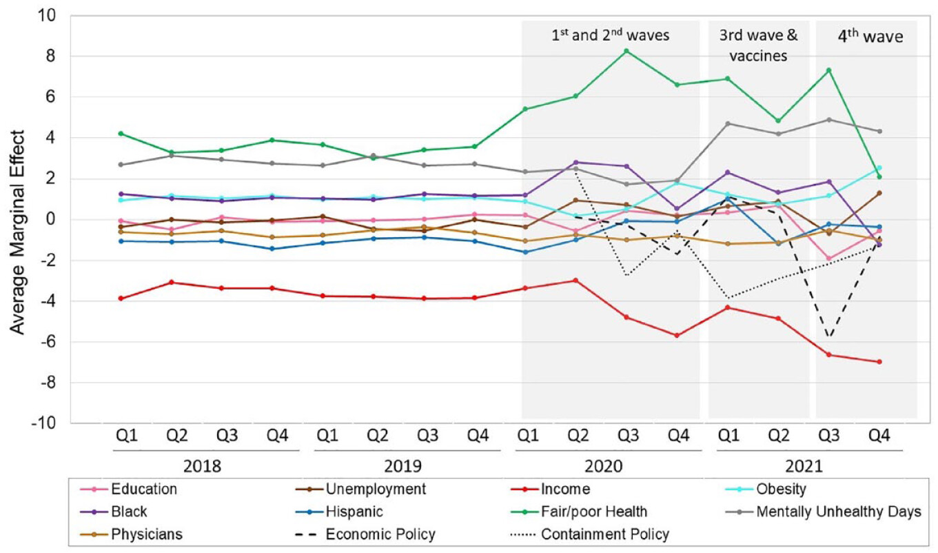 Going into the pandemic, these place-level “preexisting conditions” meant that certain counties were more vulnerable than others to experiencing high COVID-19 mortality rates as well as high rates of drug poisoning and all-cause mortality. In terms of COVID-19 mortality, significantly higher mortality rates were observed in counties with smaller shares of college-educated adults, lower median household income, higher poverty and unemployment rates, higher prevalence of preexisting health conditions, and larger shares of Black and Hispanic populations in the early waves of the pandemic but larger White population shares in later waves (