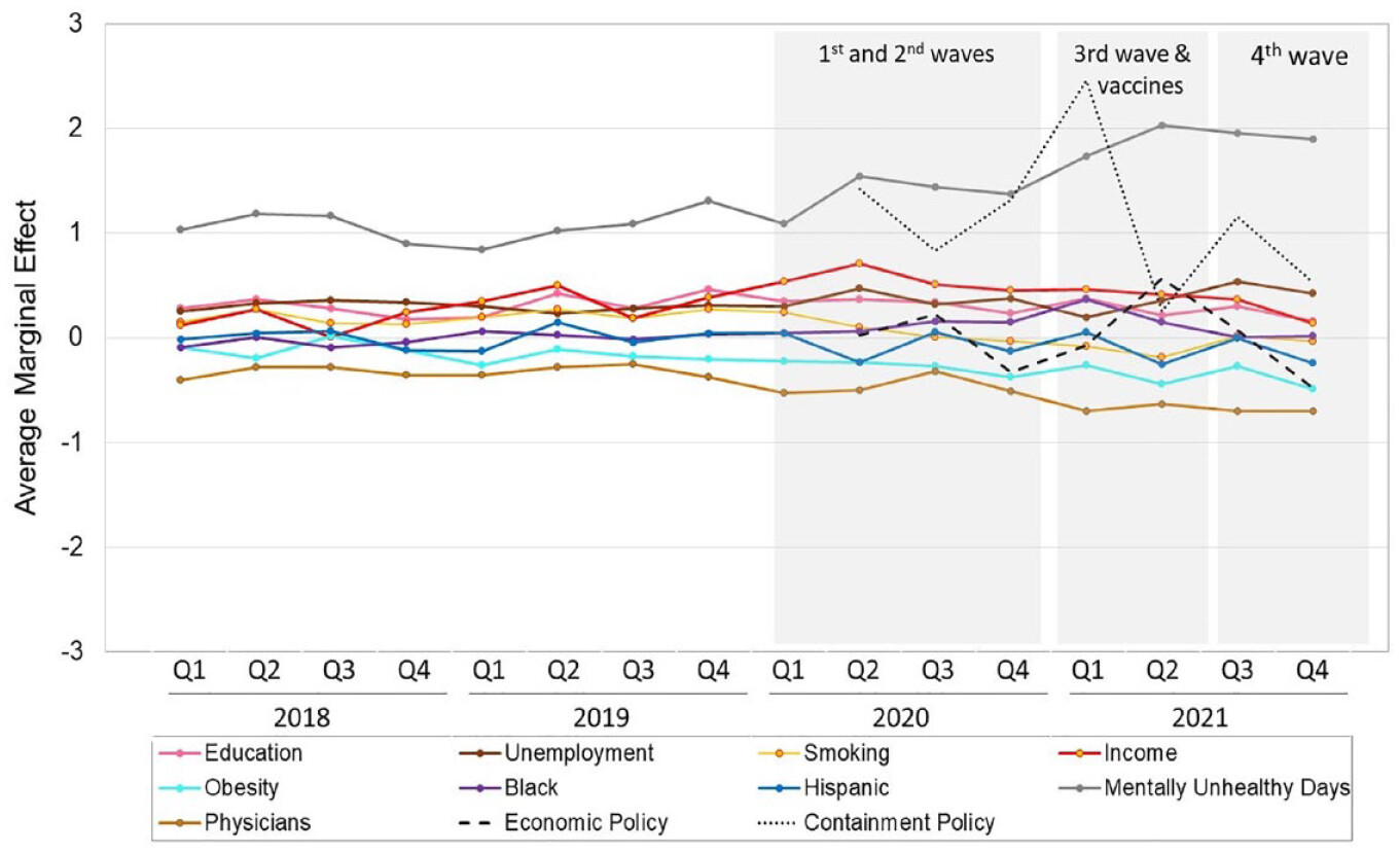Pandit et al. 2023). The comfort, resources, and control that higher income and education provide may also mean lower stress and anxiety—psychological hardships that increase risks of multiple causes of death. As an SES-related resource, health care infrastructure is also an important county-level resource. It may be more important in the face of a pandemic as demand for services increases.