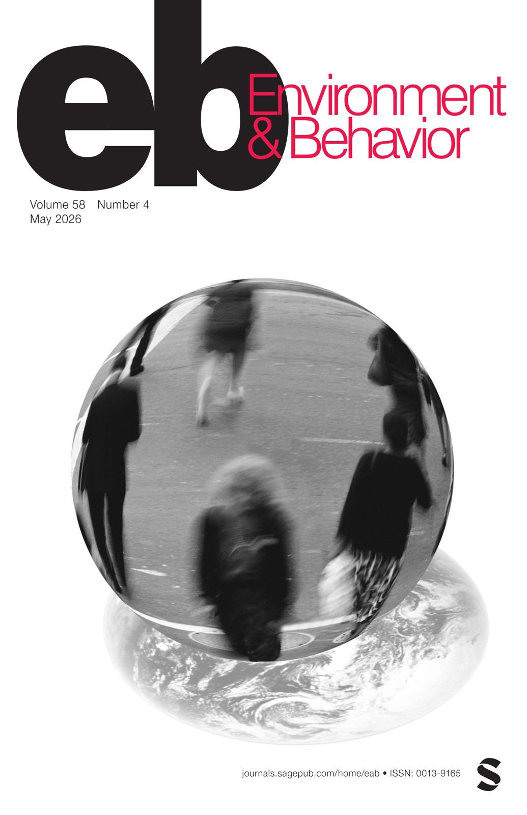 Environment and Behavior (EAB) examines relationships between human behavior and the natural and built environment. Research topics include environmental experiences (e.g., restorativeness, place attachment/identity, environmental perception/cognition); environmental outcomes (e.g., pro-environmental behaviors such as recycling; health-supportive environments; design preferences); and processes linking environments and behaviors that support or thwart human well-being. This journal is a member of the COPE. View full journal description