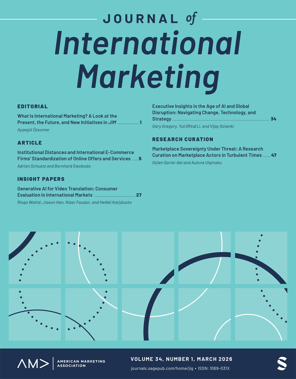 Journal of International Marketing is a peer-reviewed journal that is dedicated to advancing international marketing practice, research, and theory. Contributions addressing any aspect of international marketing are welcome. Aimed at both international marketing/business scholars and practitioners at senior- and mid-level international marketing positions, the journal's prime objective is to bridge the gap between theory and practice in international marketing. View full journal description