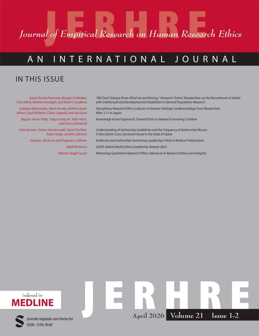 The Journal of Empirical Research on Human Research Ethics (JERHRE) is the only journal in the field of human research ethics dedicated exclusively to empirical research. Empirical knowledge translates ethical principles into procedures appropriate to specific cultures, contexts, and research topics. The journal's distinguished editorial and advisory board brings a range of expertise and international perspective to provide high-quality double-blind peer-reviewed original articles. This journal is a member of COPE. View full journal description